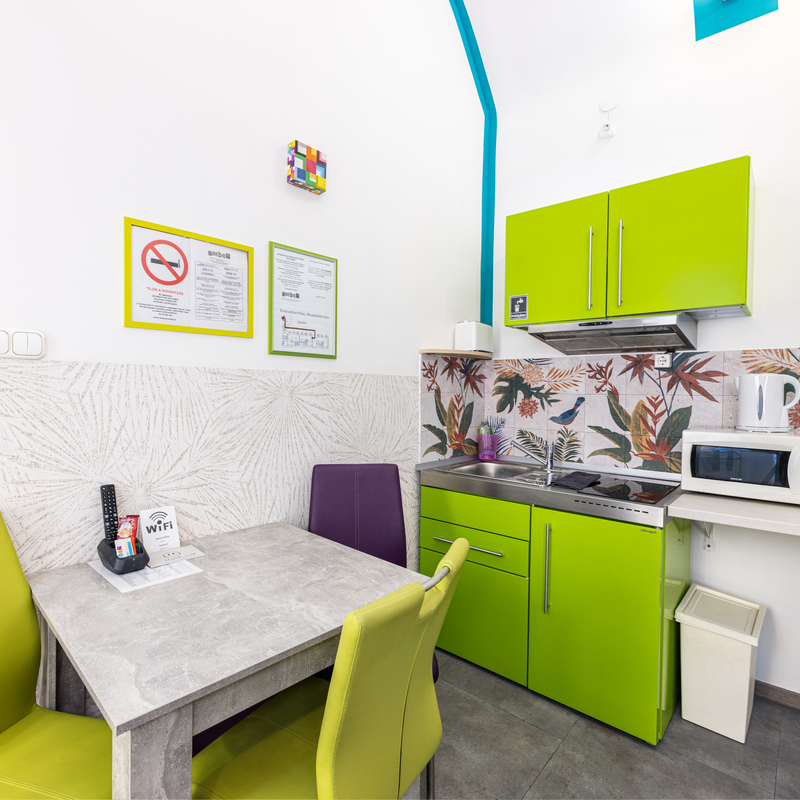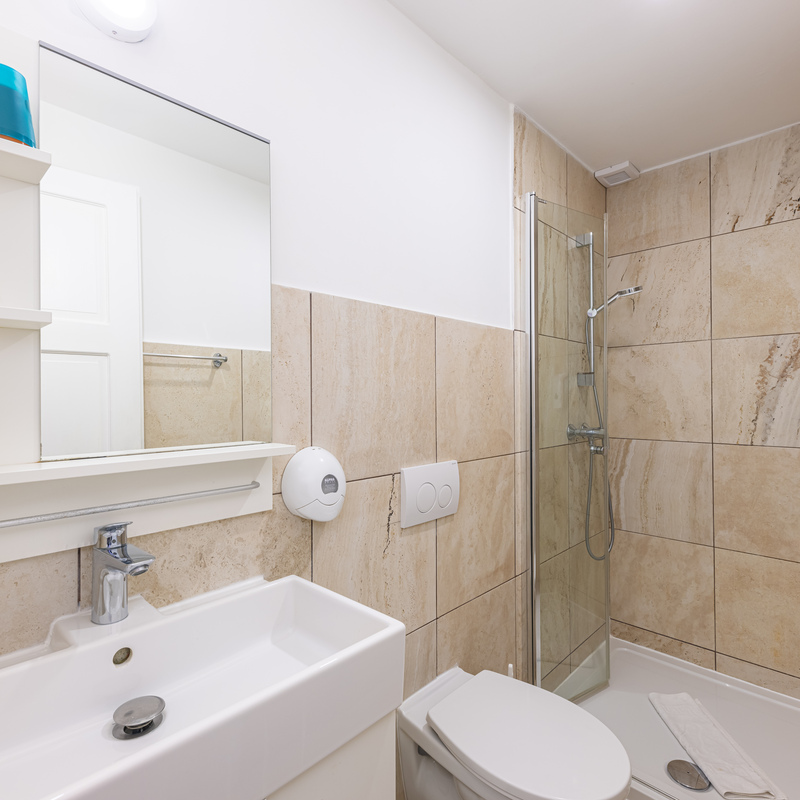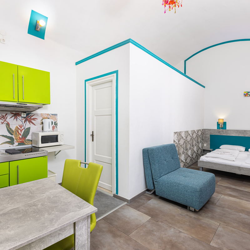 Our Medium Studios, located on the ground floor, are designed to accommodate up to 3 guests and provide the ideal choice for families or small groups seeking comfort in the heart of Budapest. With a generous size of up to 25 m², these studios combine modern amenities with the unique charm of our lovingly restored 19th-century building. Each Medium Studio features: A European queen-size bed (160 x 200 cm) and a single sofa bed (70 x 200 cm), a private bathroom with shower and toilet and a comfortable seating area.